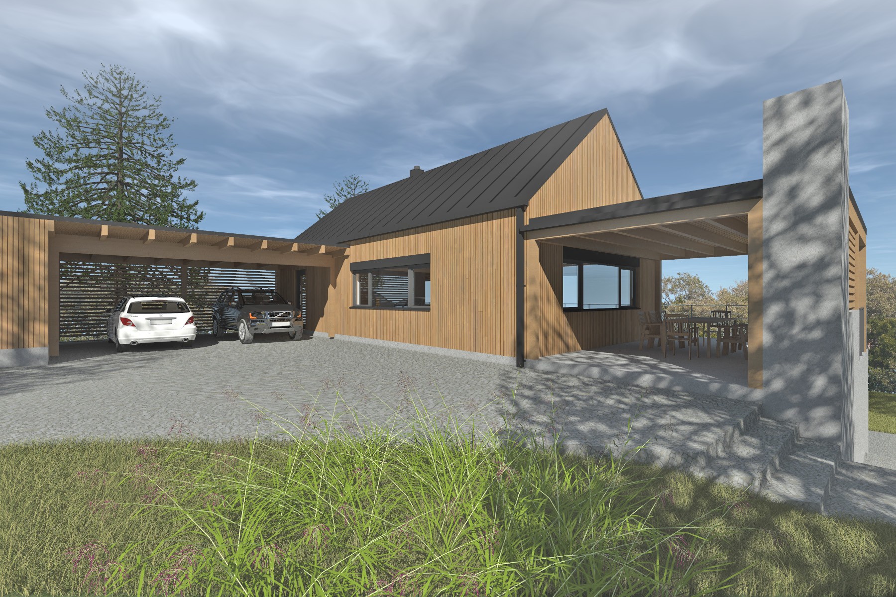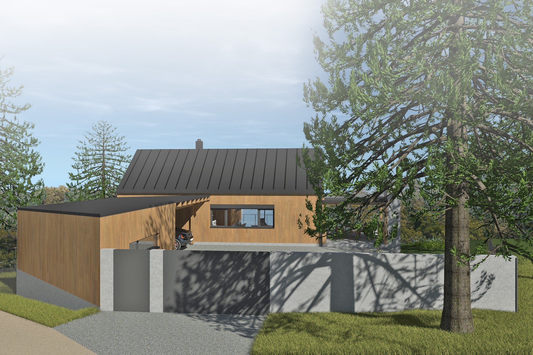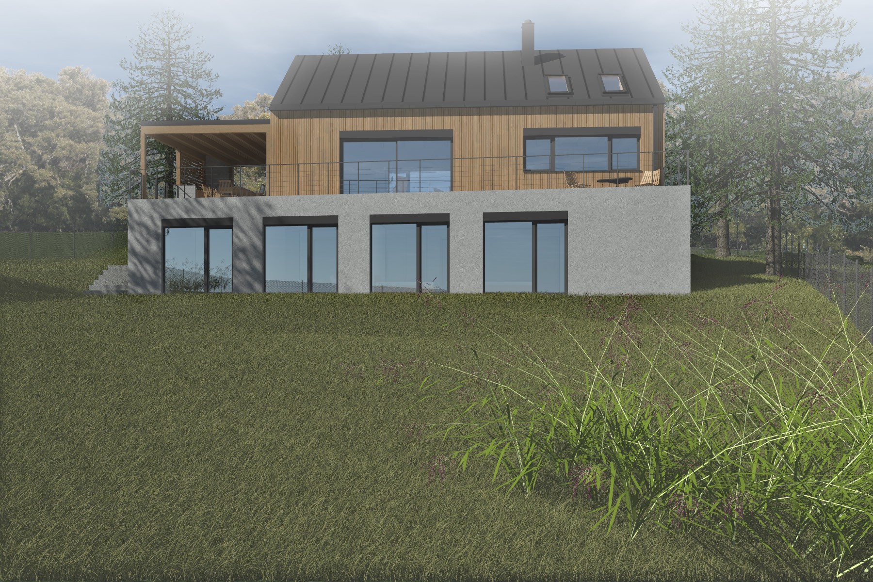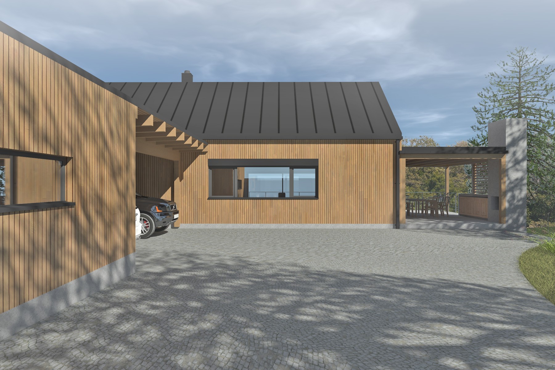 Materiálové řešení vychází z konstrukční logiky stavby. Dolní podlaží je navrženo jako masivní zděná či monolitická konstrukce, která zároveň stabilizuje objekt ve svahu. Horní část domu je řešena jako dřevostavba s vertikálním dřevěným obkladem, který přirozeně zapadá do lesního prostředí okolní krajiny. Krytá terasa, parkovací stání a pergola doplňují hlavní hmotu objektu a vytvářejí funkční venkovní zázemí rekreačního domu.