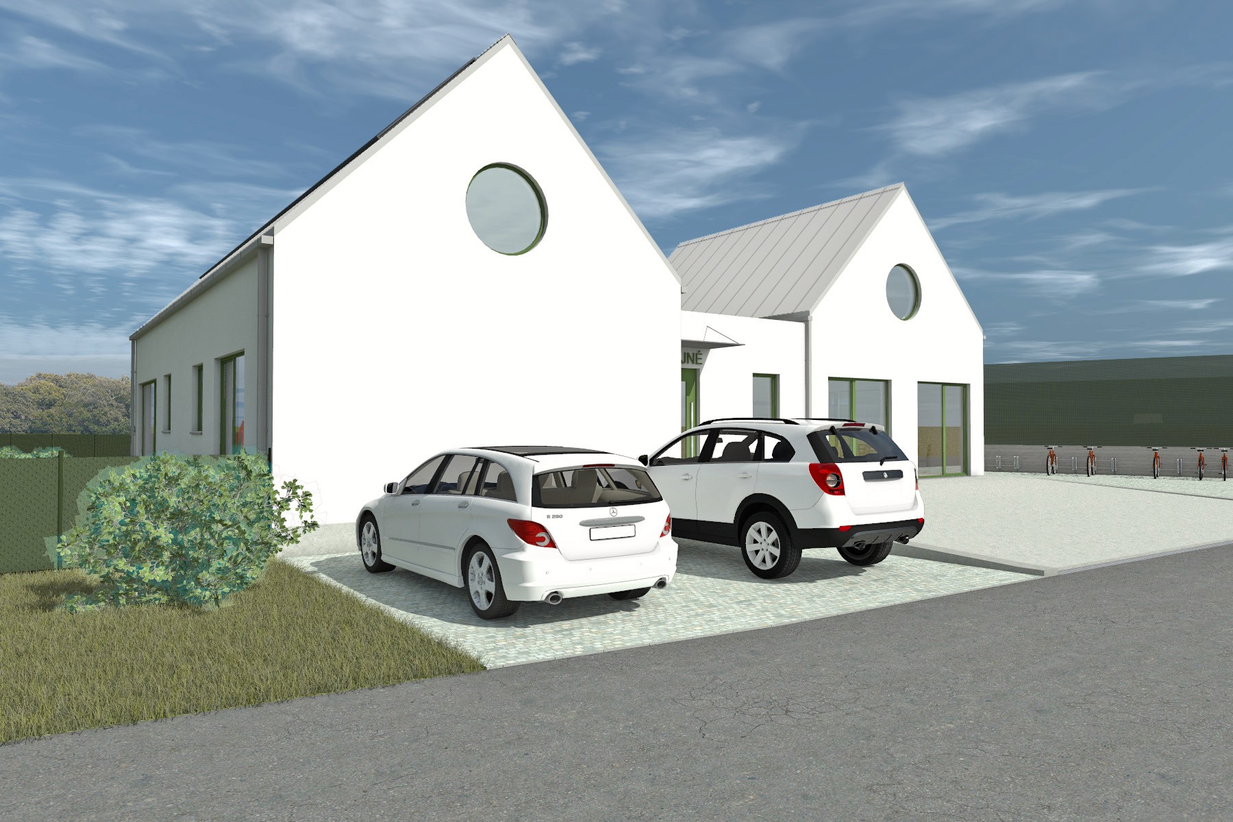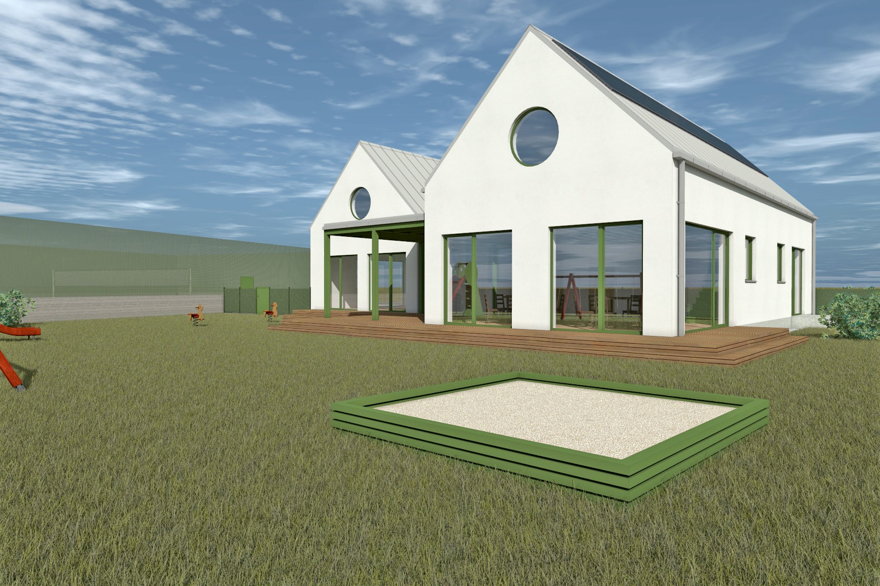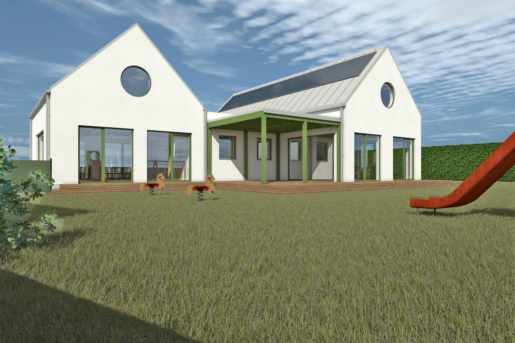 Objekt je navržen jako přízemní nepodsklepená stavba s částečně využitým podkrovím. Dvě hlavní hmoty se sedlovou střechou jsou propojeny nižší částí se střechou pultovou, která vytváří vstupní prostor a krytou terasu směrem do zahrady. Součástí návrhu je také venkovní herní zahrada navazující na interiér dětské skupiny.