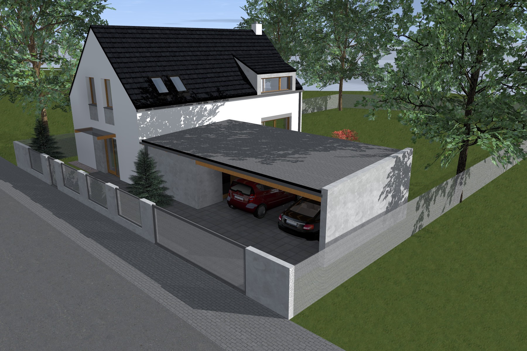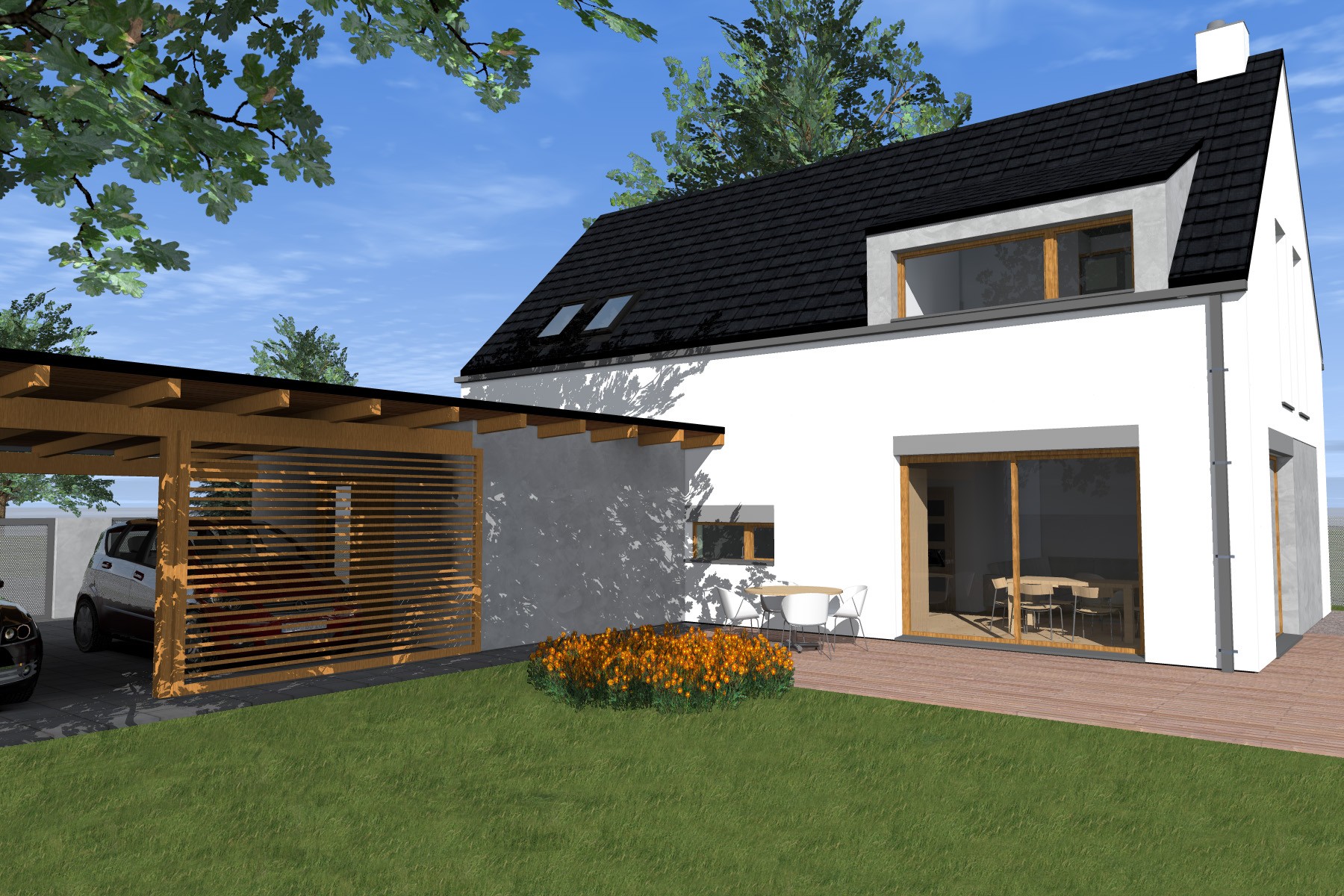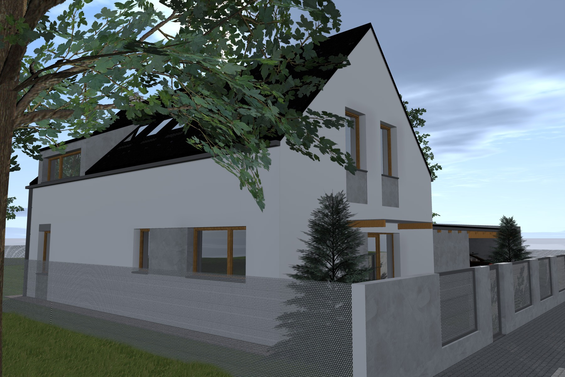 Kompaktní dvoupodlažní objem je doplněn přízemní hmotou zahradního skladu a krytého parkovacího stání, která přirozeně navazuje na hlavní stavbu. Střešní rovinu oživují výrazné vikýře, které přivádějí do podkroví světlo a současně formují charakter domu.