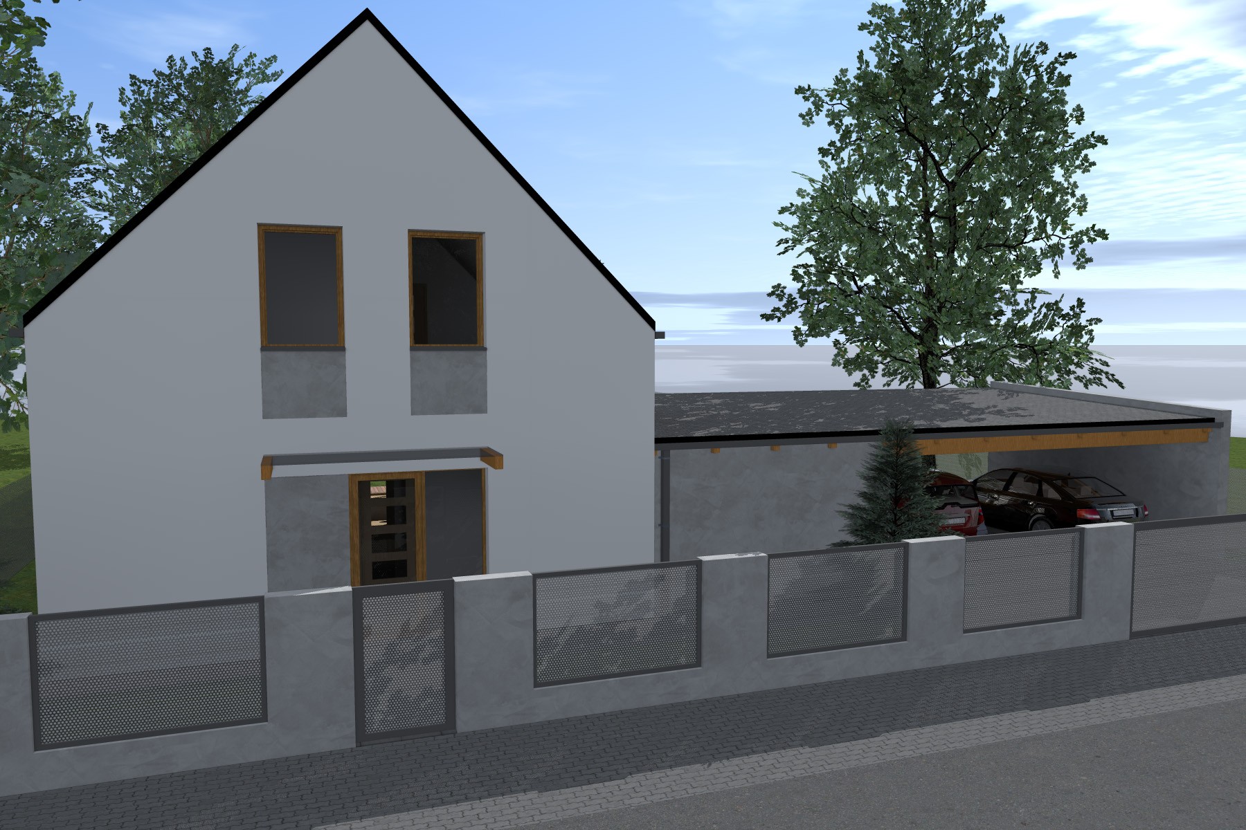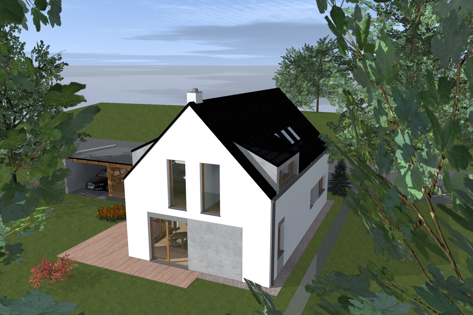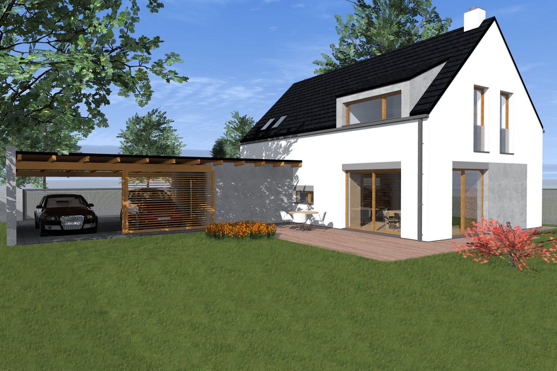 Kompaktní dvoupodlažní objem je doplněn přízemní hmotou zahradního skladu a krytého parkovacího stání, která přirozeně navazuje na hlavní stavbu. Střešní rovinu oživují výrazné vikýře, které přivádějí do podkroví světlo a současně formují charakter domu.