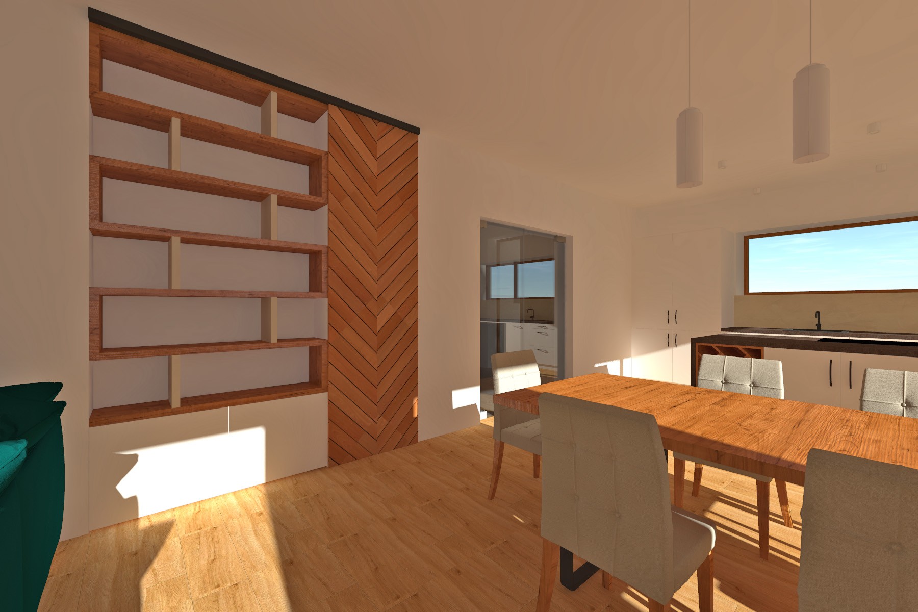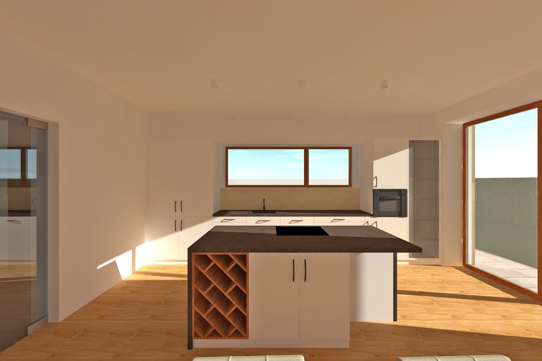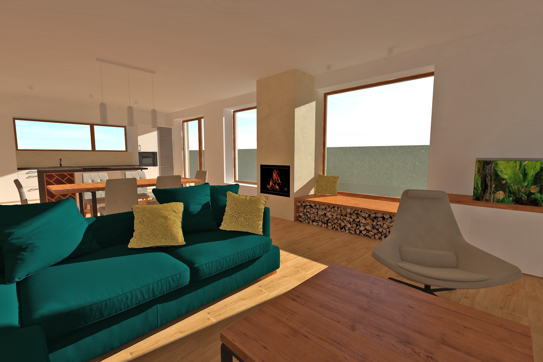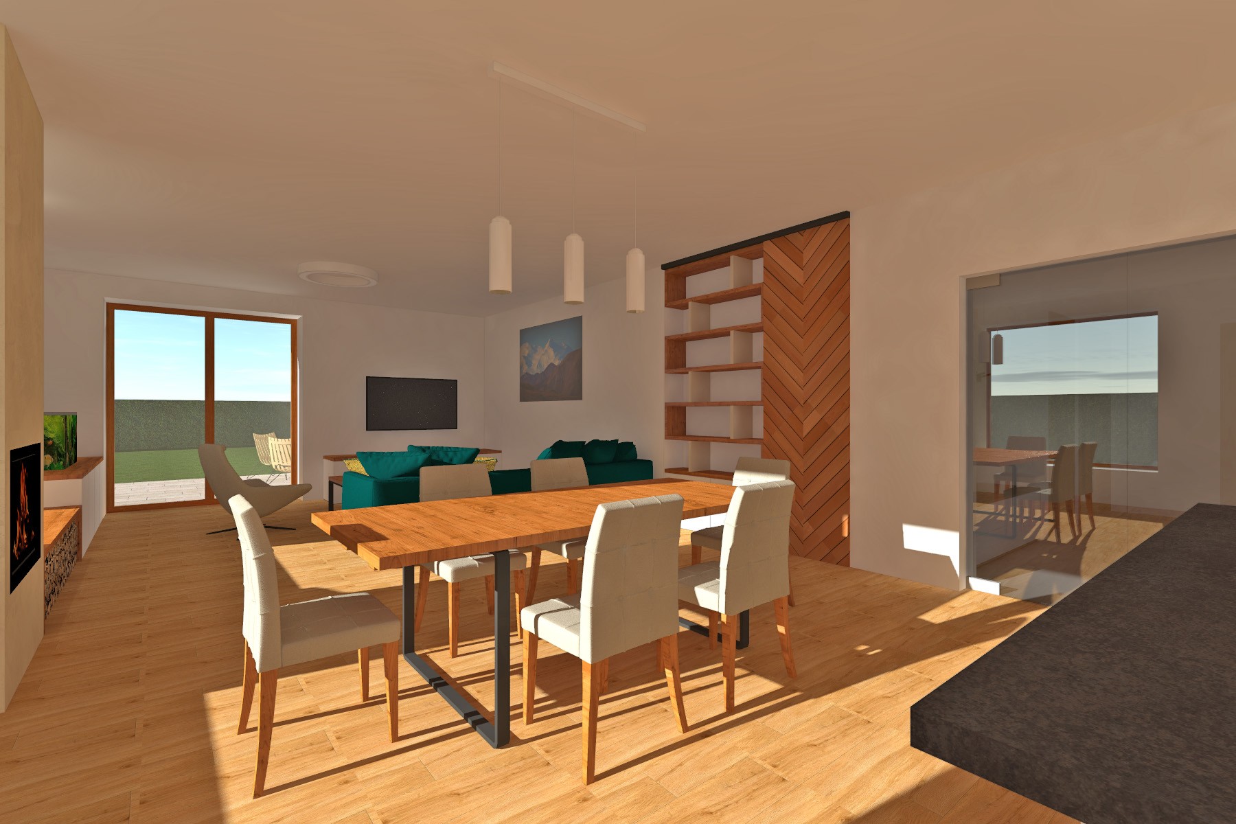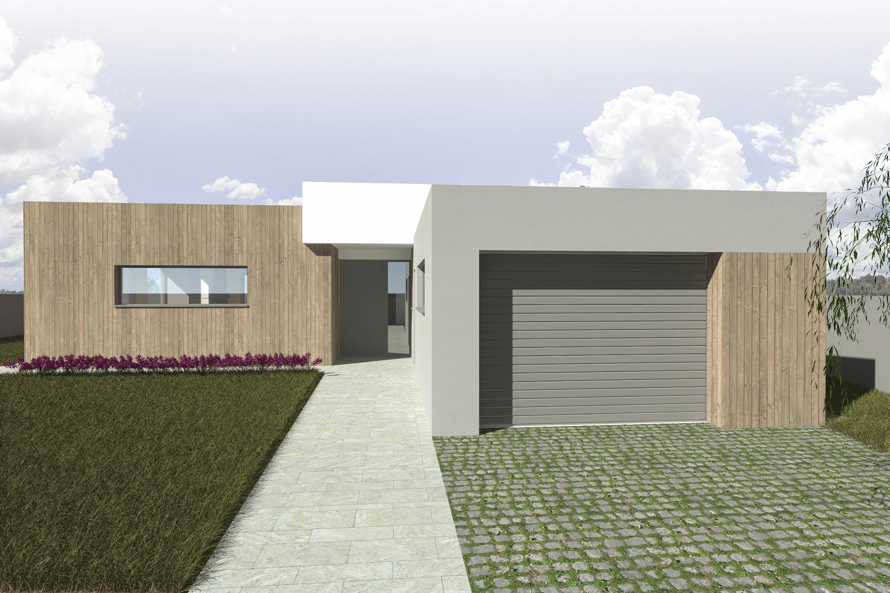 Materiálové řešení kombinuje světlou omítku s plochami v imitaci dřeva, které dodávají domu přirozený a současný výraz. Výsledkem je klidná, moderní architektura, která respektuje charakter nové obytné zástavby a nabízí komfortní bydlení s důrazem na propojení interiéru se zahradou.