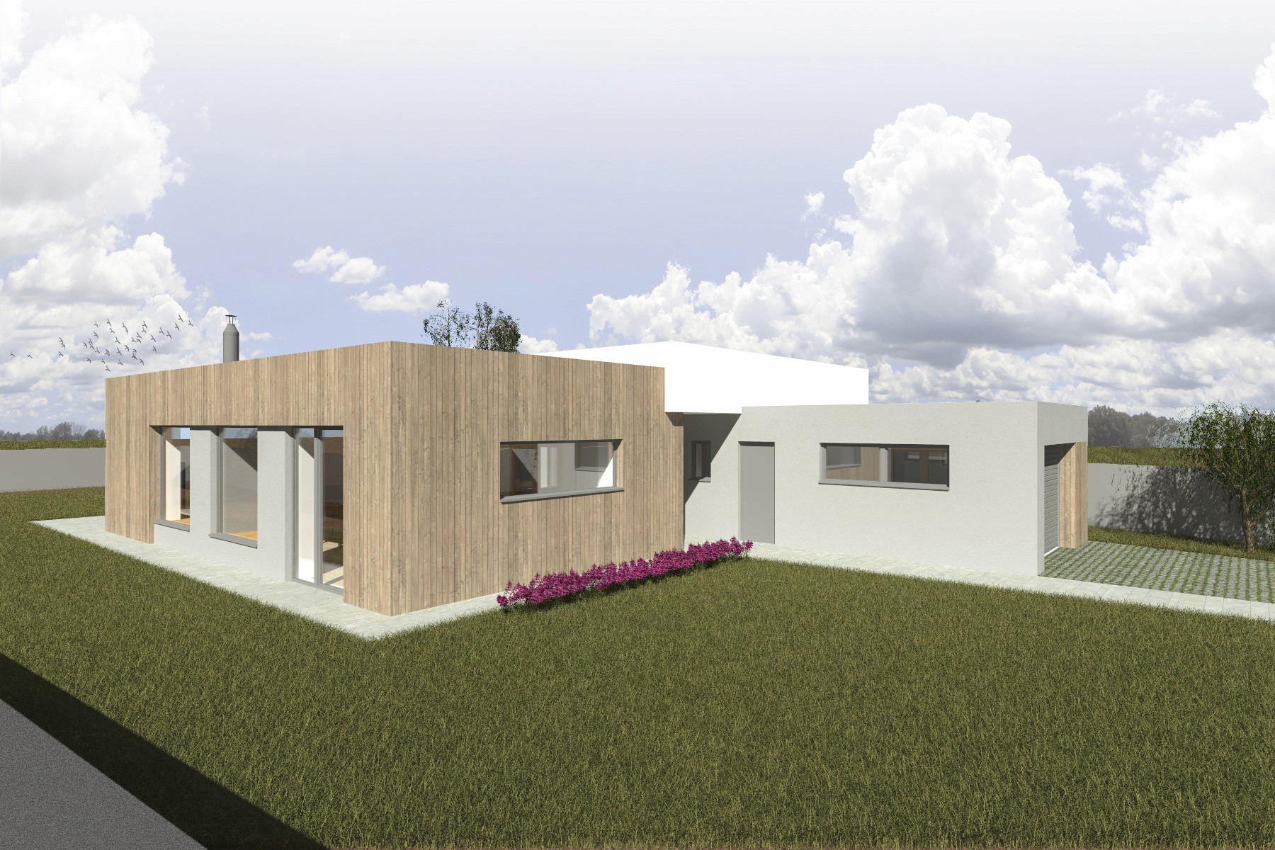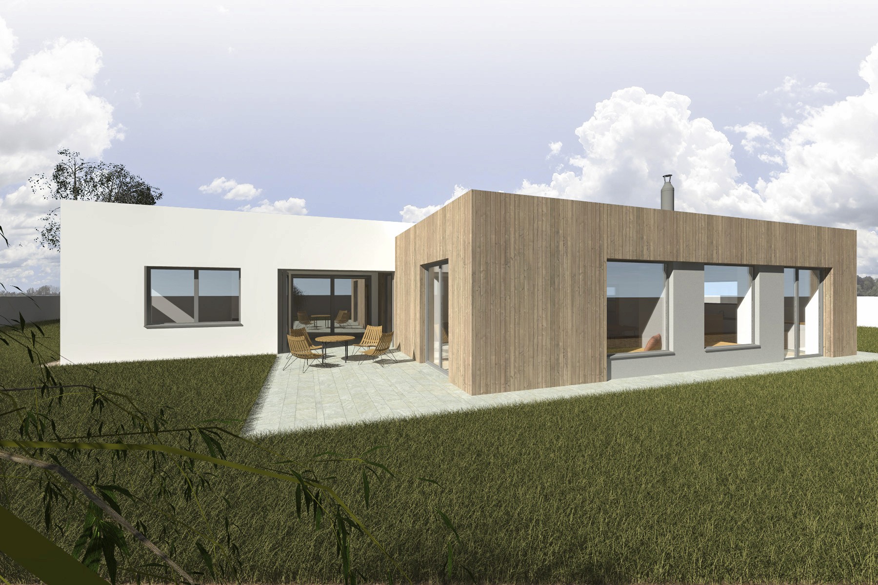 Jednopodlažní rodinný dům je navržen na mírně svažitém pozemku v nové rezidenční lokalitě U Stromovky v Českých Budějovicích. Kompozice domu vychází z jednoduchého půdorysu ve tvaru písmene L, který přirozeně vytváří chráněný venkovní prostor s terasou orientovanou do zahrady.