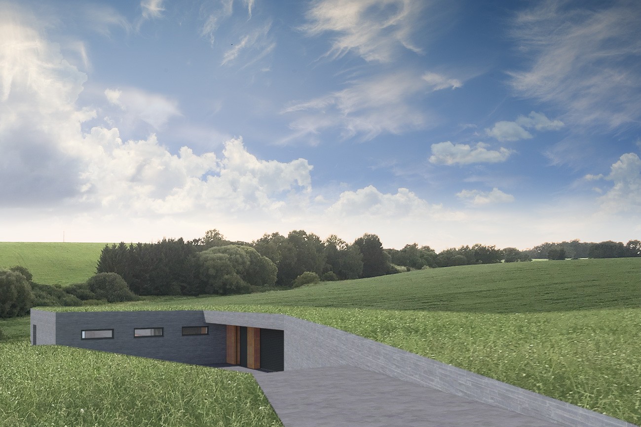 Objekt je částečně zapuštěn do terénu a svou horizontální kompozicí přirozeně navazuje na modelaci svahu. Obytná část domu je orientována směrem do krajiny a otevírá se velkými prosklenými plochami na terasu a okolní výhledy.