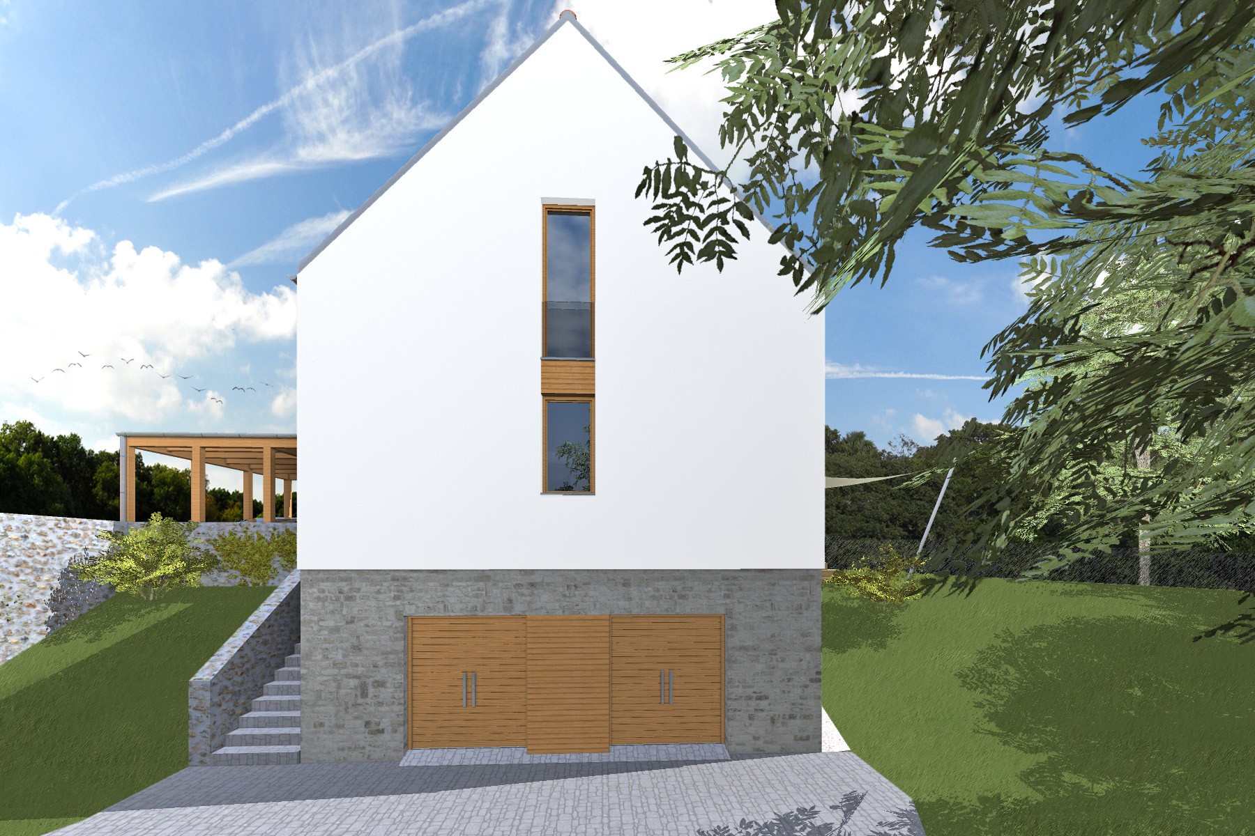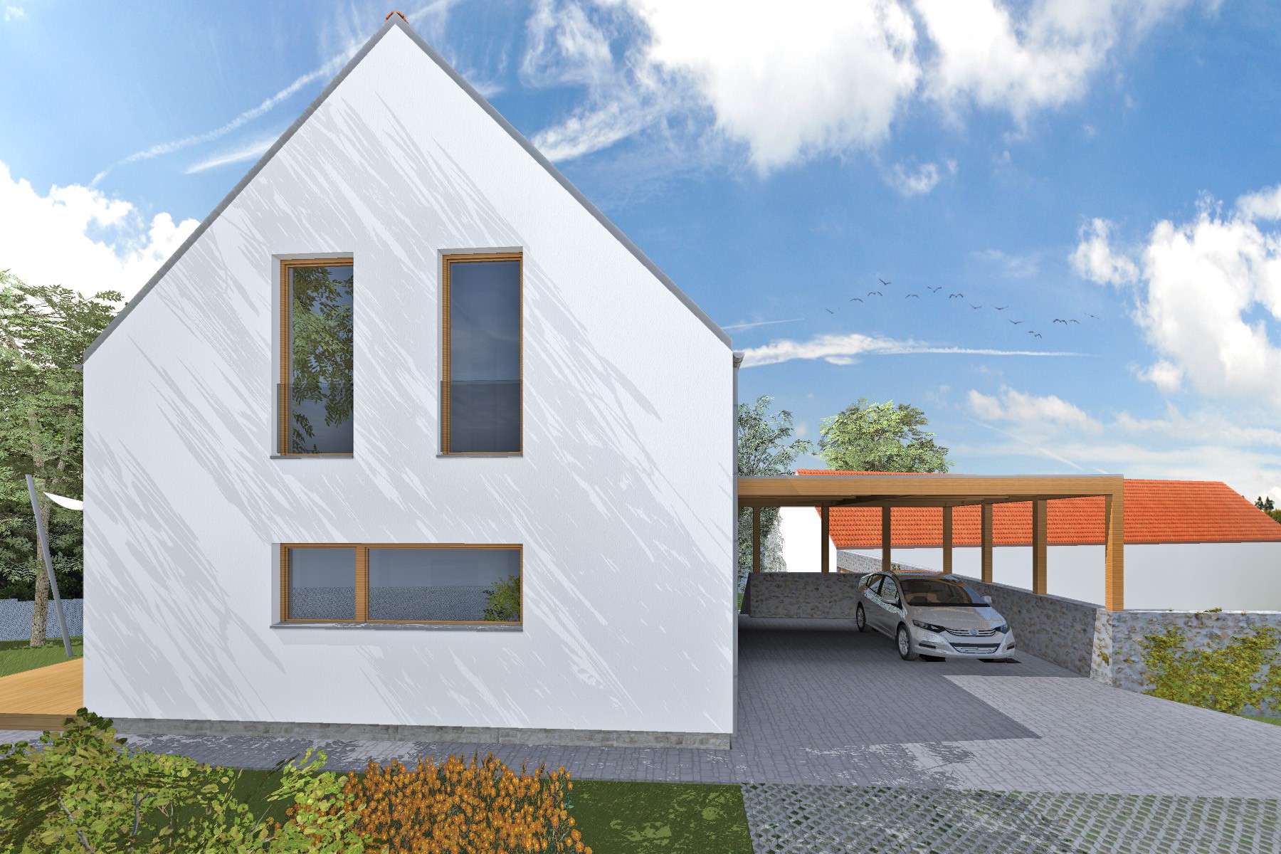 Hlavní hmota domu je zastřešena sedlovou střechou, která přirozeně navazuje na tradiční charakter obce. Na dům navazuje kryté parkovací stání, které rozšiřuje vstupní část domu a vytváří krytý nástupní prostor.