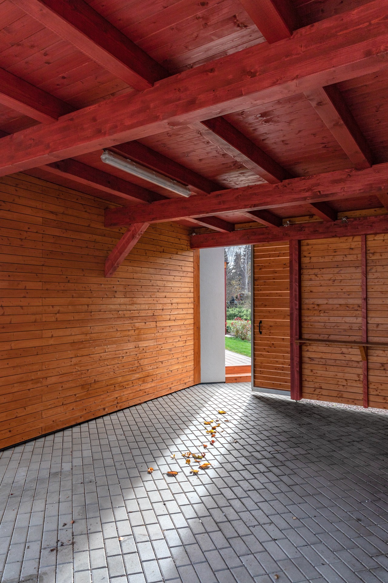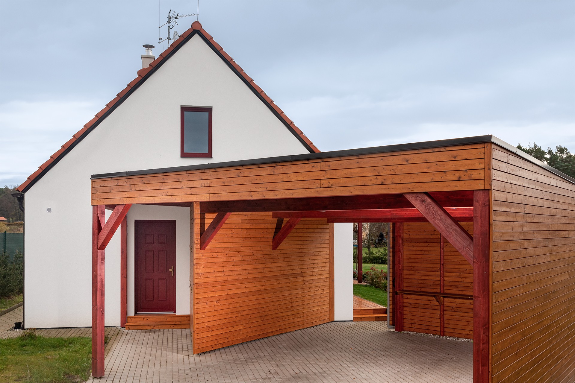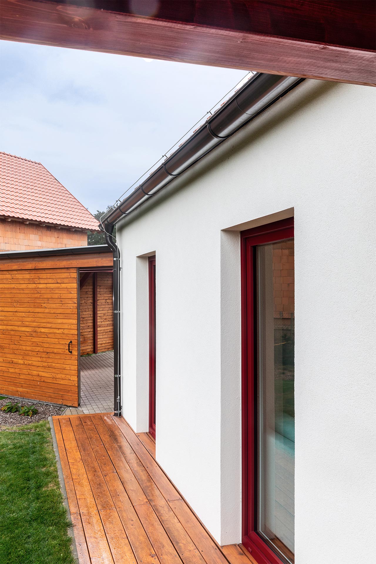 Kompozice domu je rozdělena do dvou základních hmot. Hlavní obytný objem se sedlovou střechou doplňuje lehká přízemní konstrukce krytého parkovacího stání s dřevěným obkladem. Tato část zároveň vytváří přirozenou bariéru mezi zahradou a přilehlou komunikací.