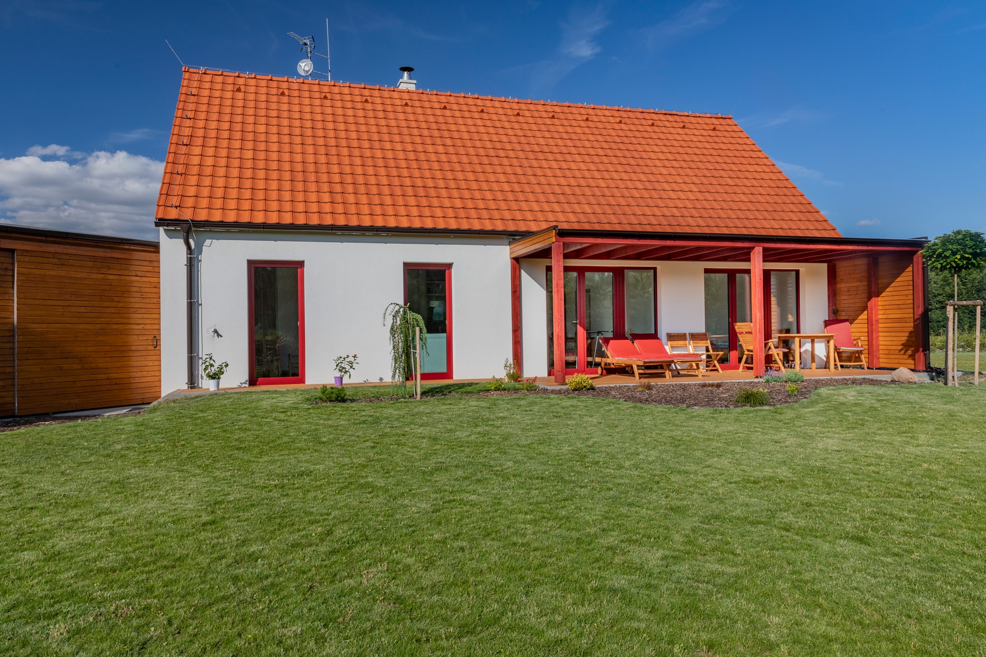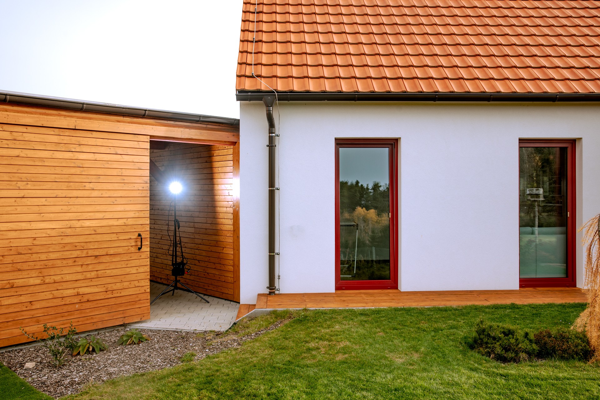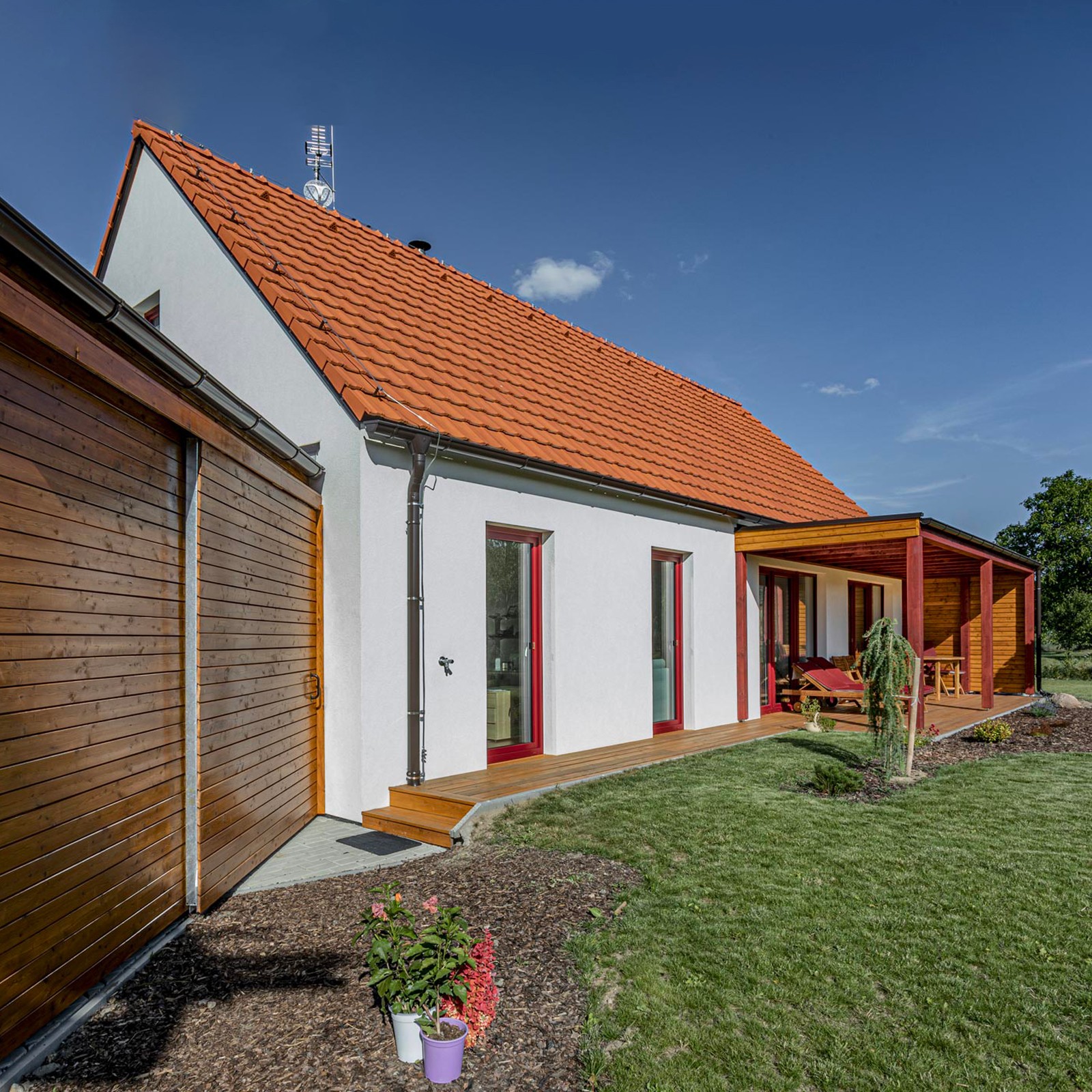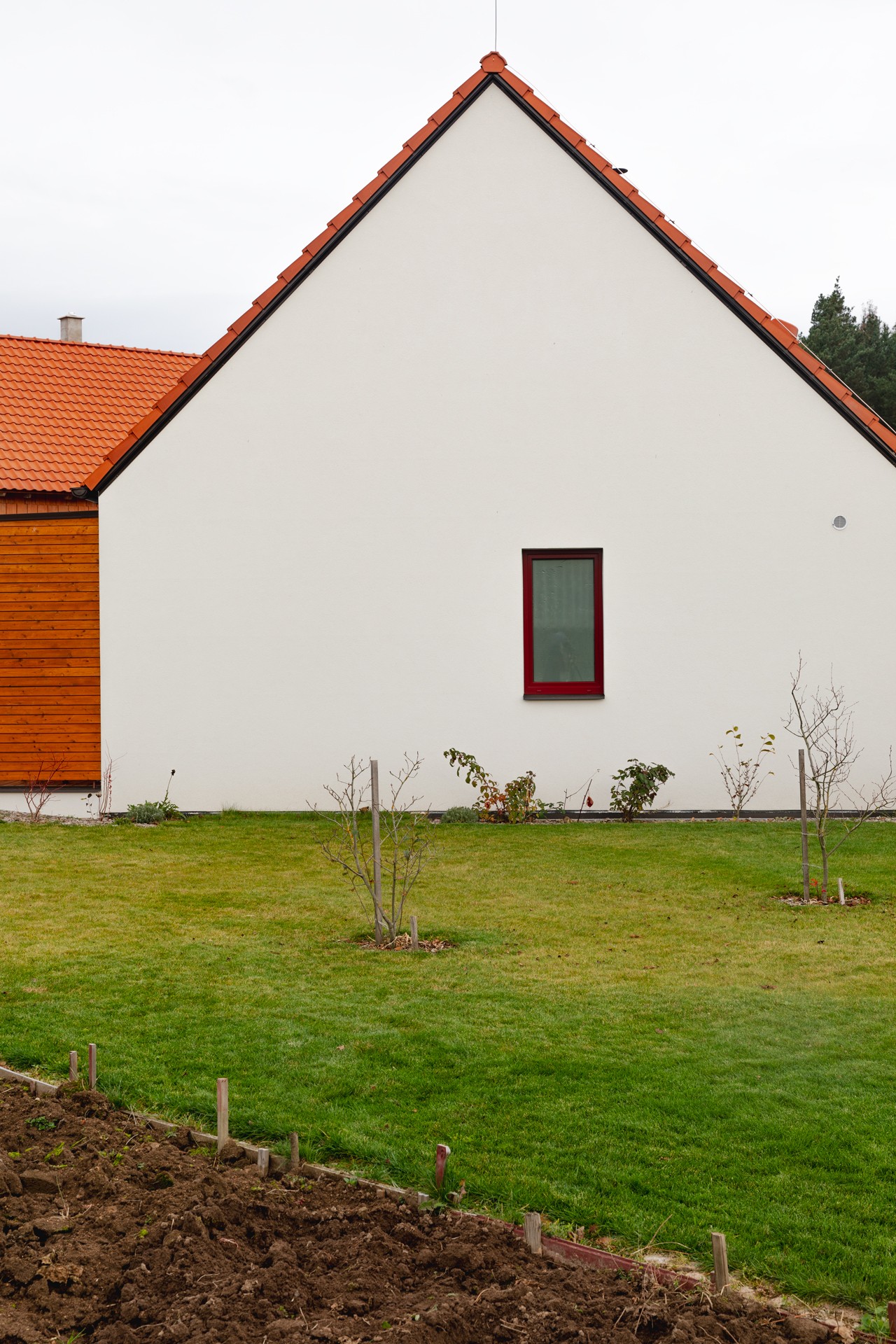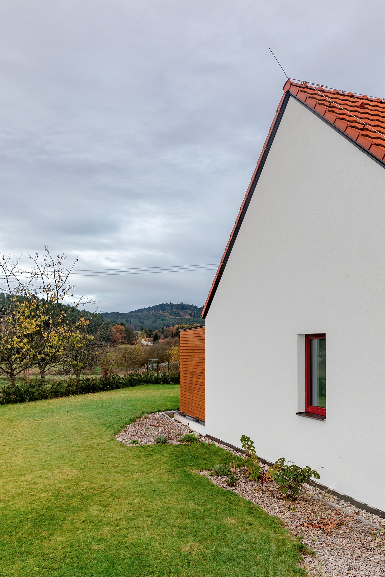 Dům tak kombinuje tradiční tvarosloví venkovské architektury s jednoduchým současným výrazem a přirozeně zapadá do krajinného prostředí.