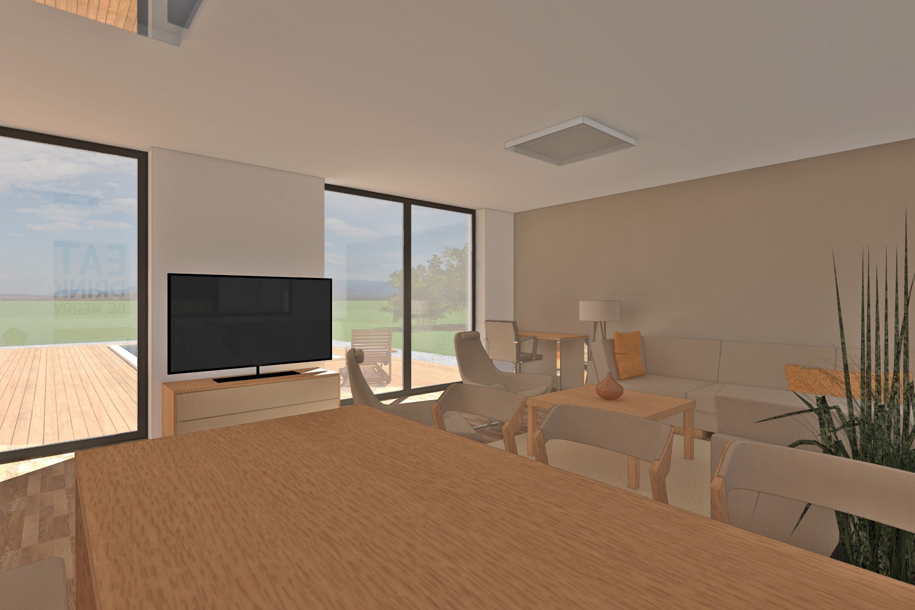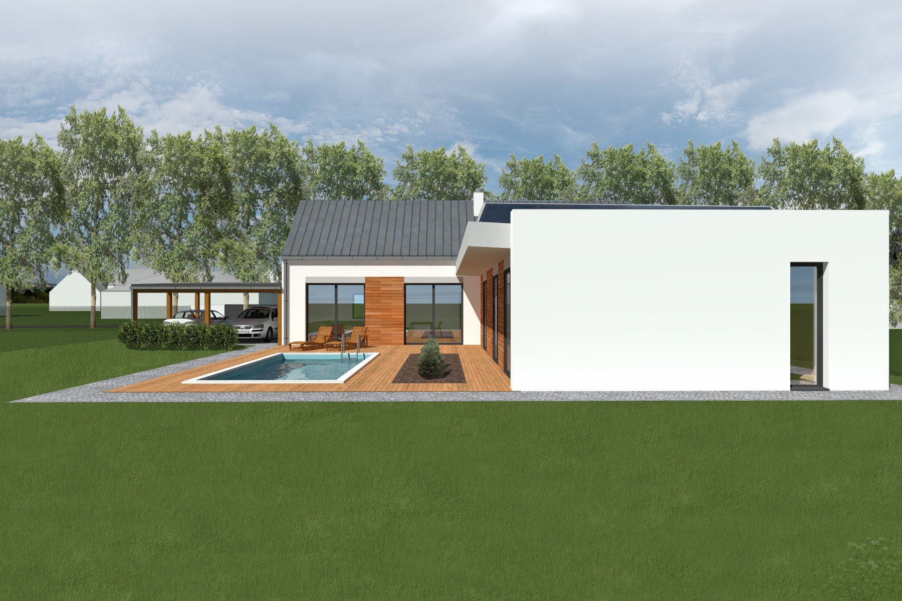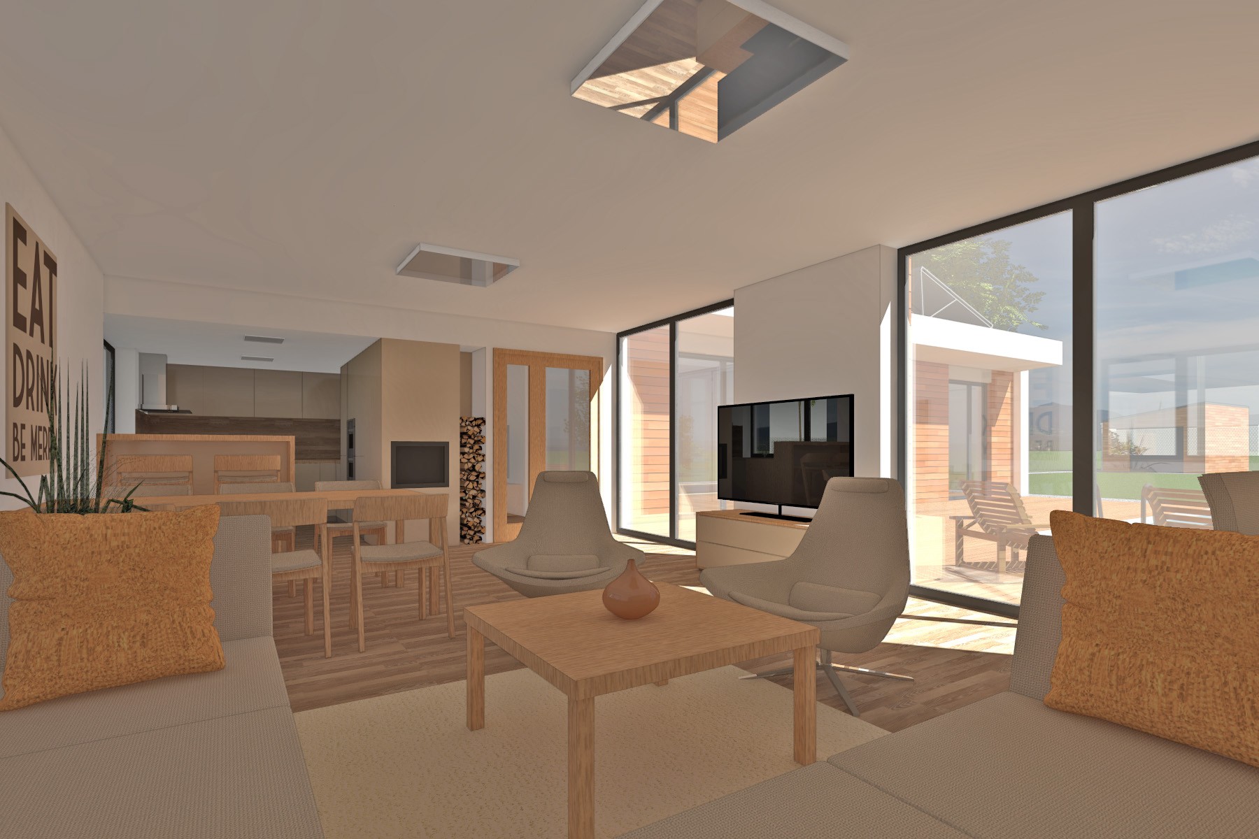Materiálové řešení kombinuje světlou omítku s dřevěným obkladem a velkými prosklenými plochami, které propojují interiér s terasou a zahradou.
