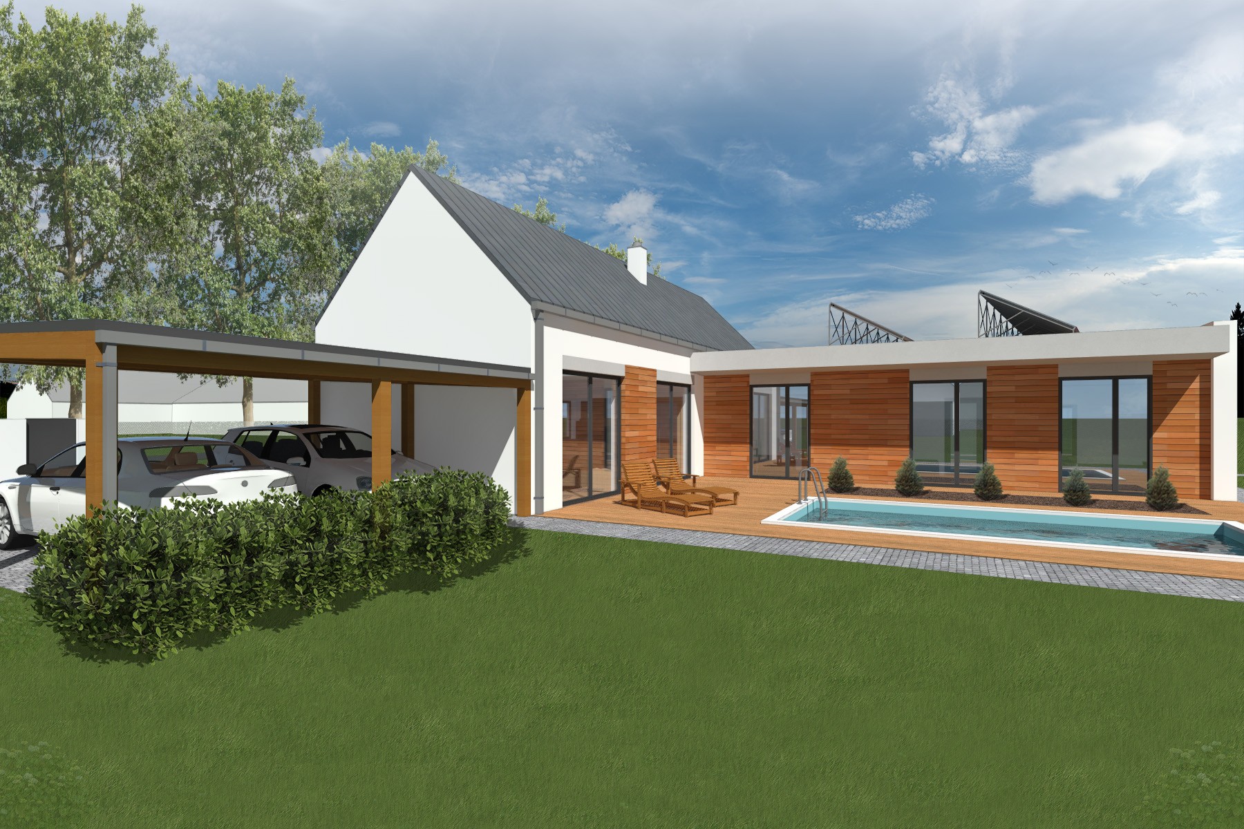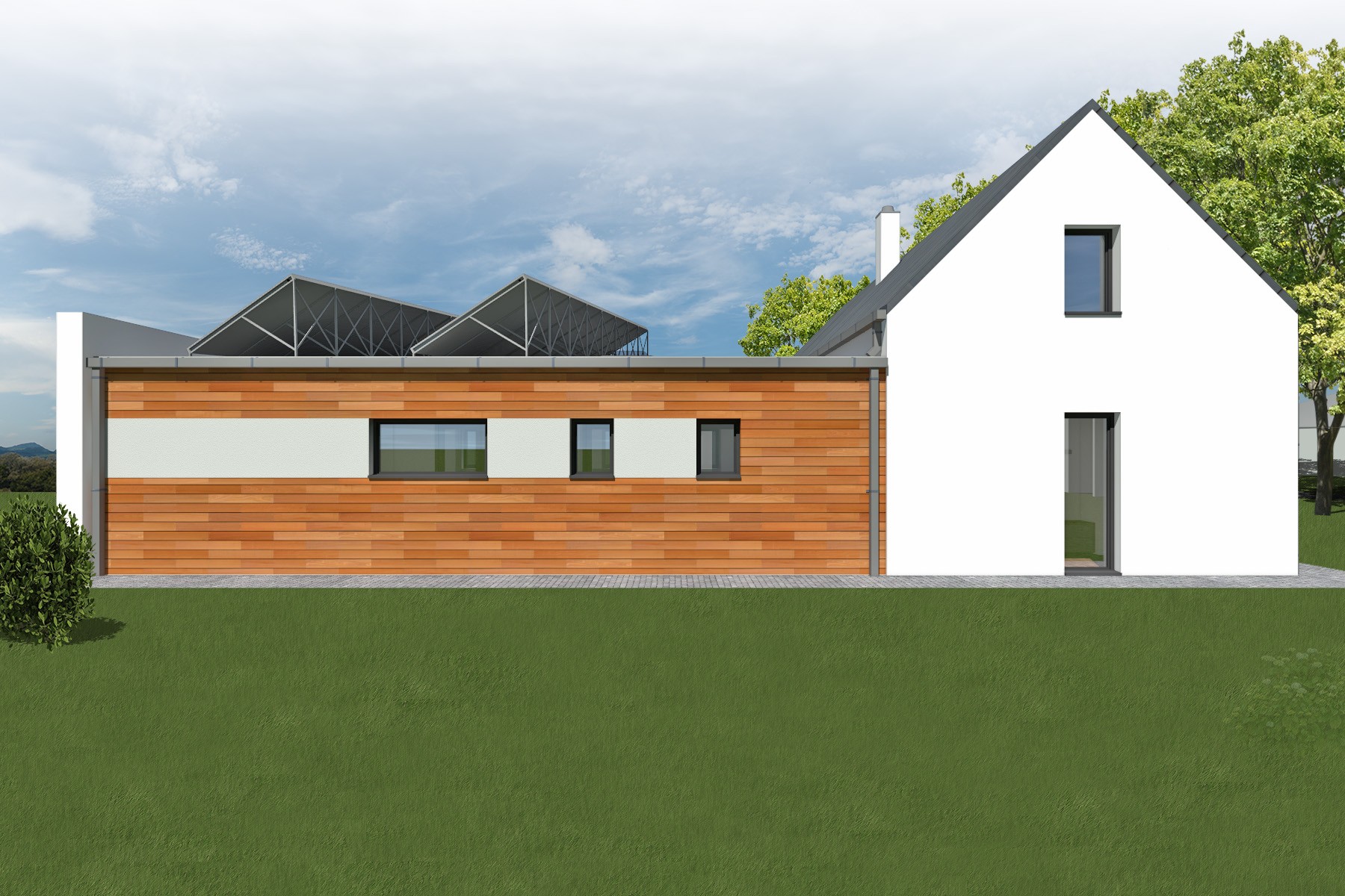 Uliční část domu se sedlovou střechou navazuje na charakter okolní zástavby. Do zahrady je dům rozvinut nízkou hmotou s plochou střechou, která přirozeně přechází do kryté terasy s venkovním bazénem.