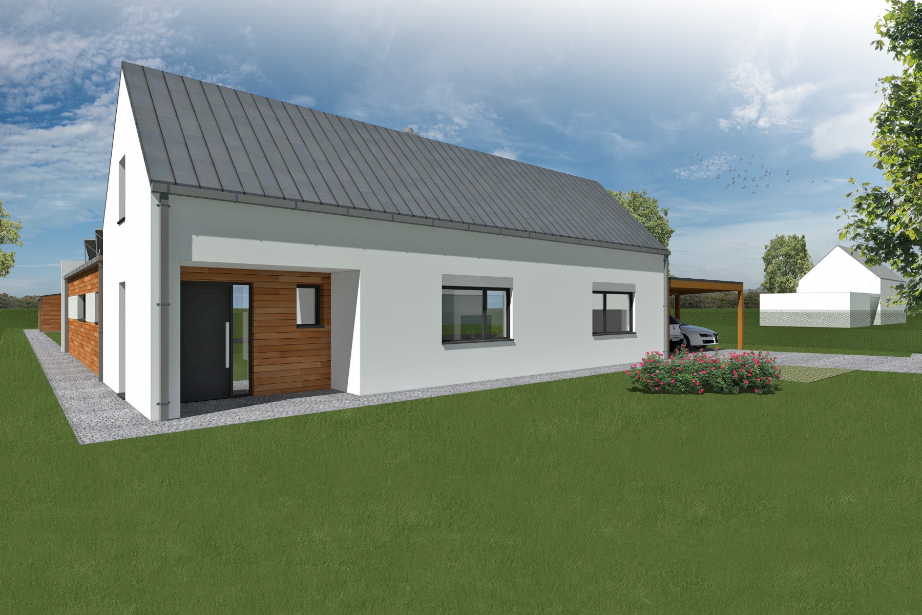 Rodinný dům je navržen v nové obytné lokalitě na okraji obce Jílovice na rovinatém pozemku s otevřeným výhledem do okolní krajiny. Hmota domu je koncipována jako přízemní objekt ve tvaru písmene L.