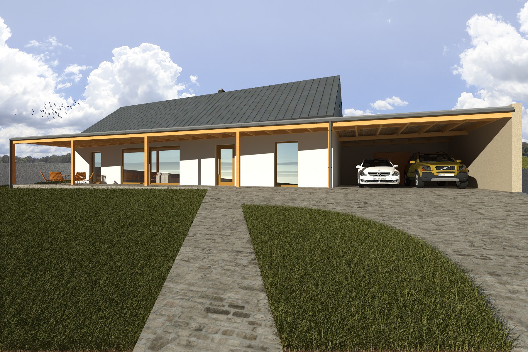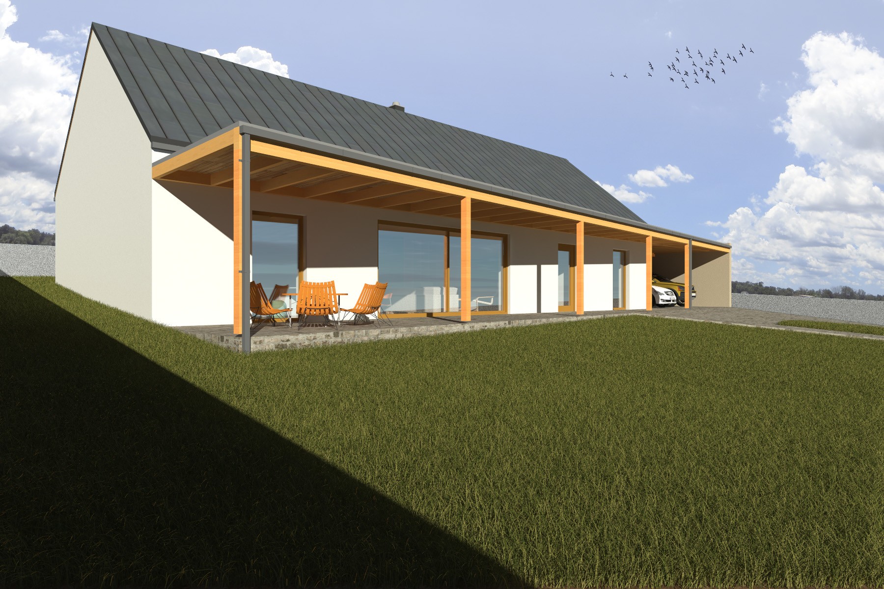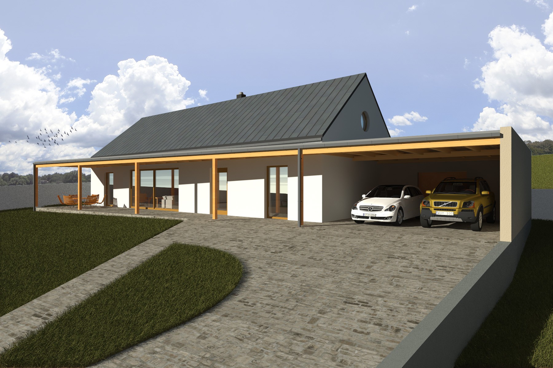Na obytnou část navazuje kryté parkovací stání, které je architektonicky sjednoceno s hlavní hmotou domu. Materiálové řešení kombinuje světlou omítku, dřevo a tmavou plechovou střechu, čímž vzniká současná a zároveň přirozeně působící stavba citlivě zasazená do venkovské krajiny.