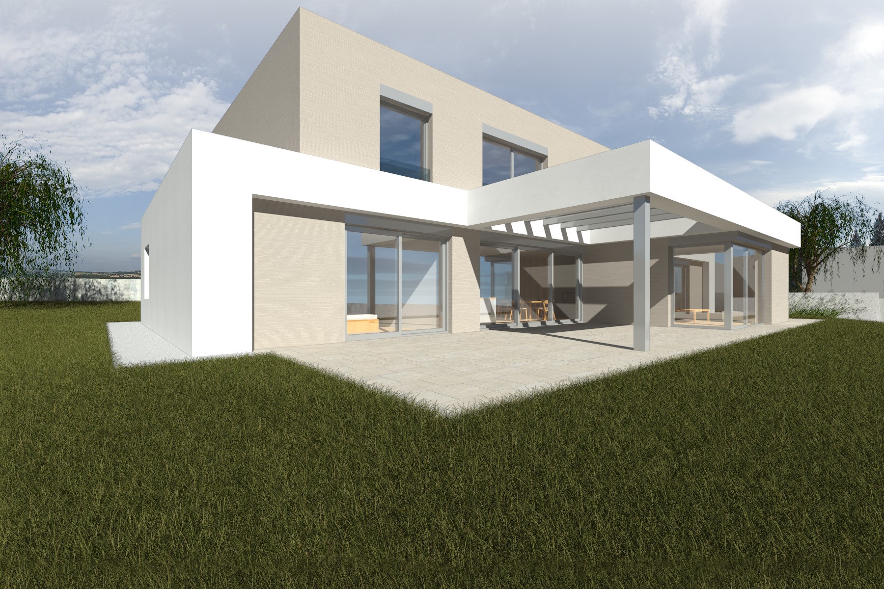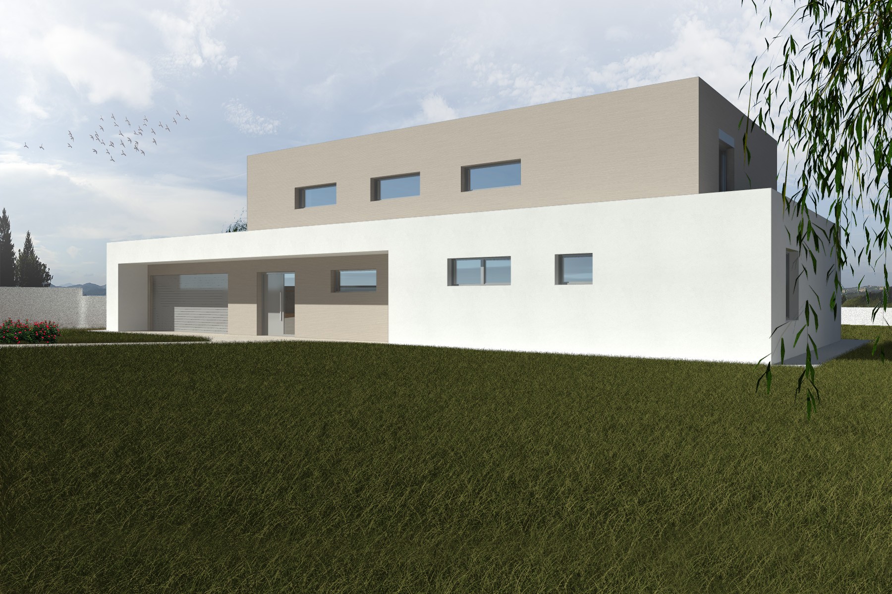 Materiálové řešení pracuje s kombinací světlé omítky a jemně strukturovaného povrchu horního podlaží, čímž vzniká čistá a nadčasová architektura odpovídající současnému způsobu bydlení.