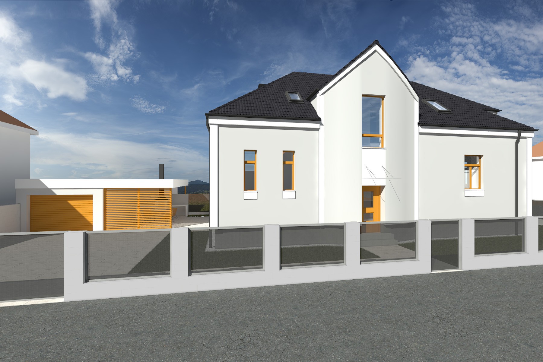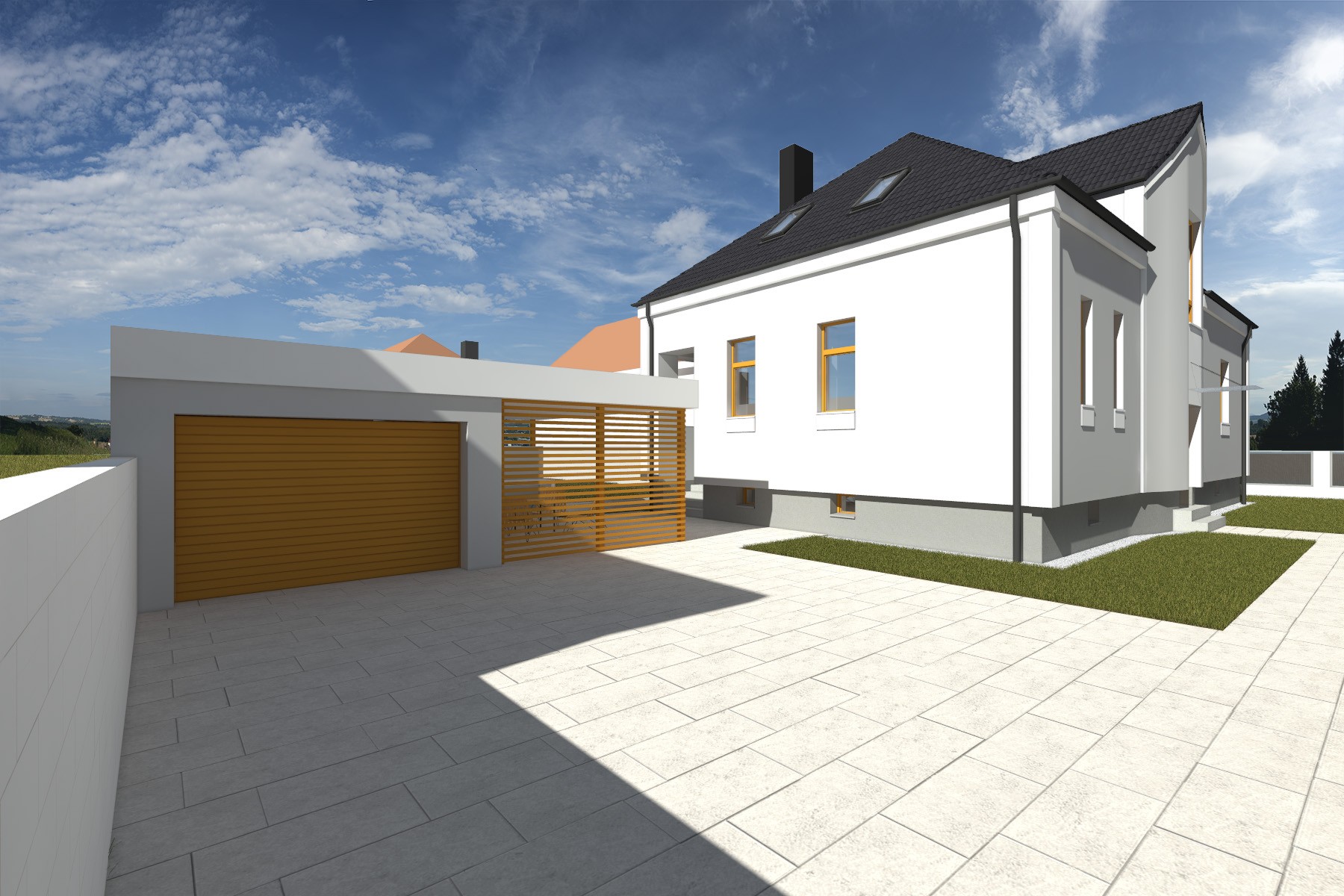 Součástí návrhu je také úprava vstupního prostoru a doplnění jednoduchého přístřešku pro parkování, který je propojen s domem lehkou pergolovou konstrukcí. Modernizace domu tak kombinuje soudobé materiály a detaily s respektem k architektuře původní stavby i charakteru okolní vilové čtvrti.