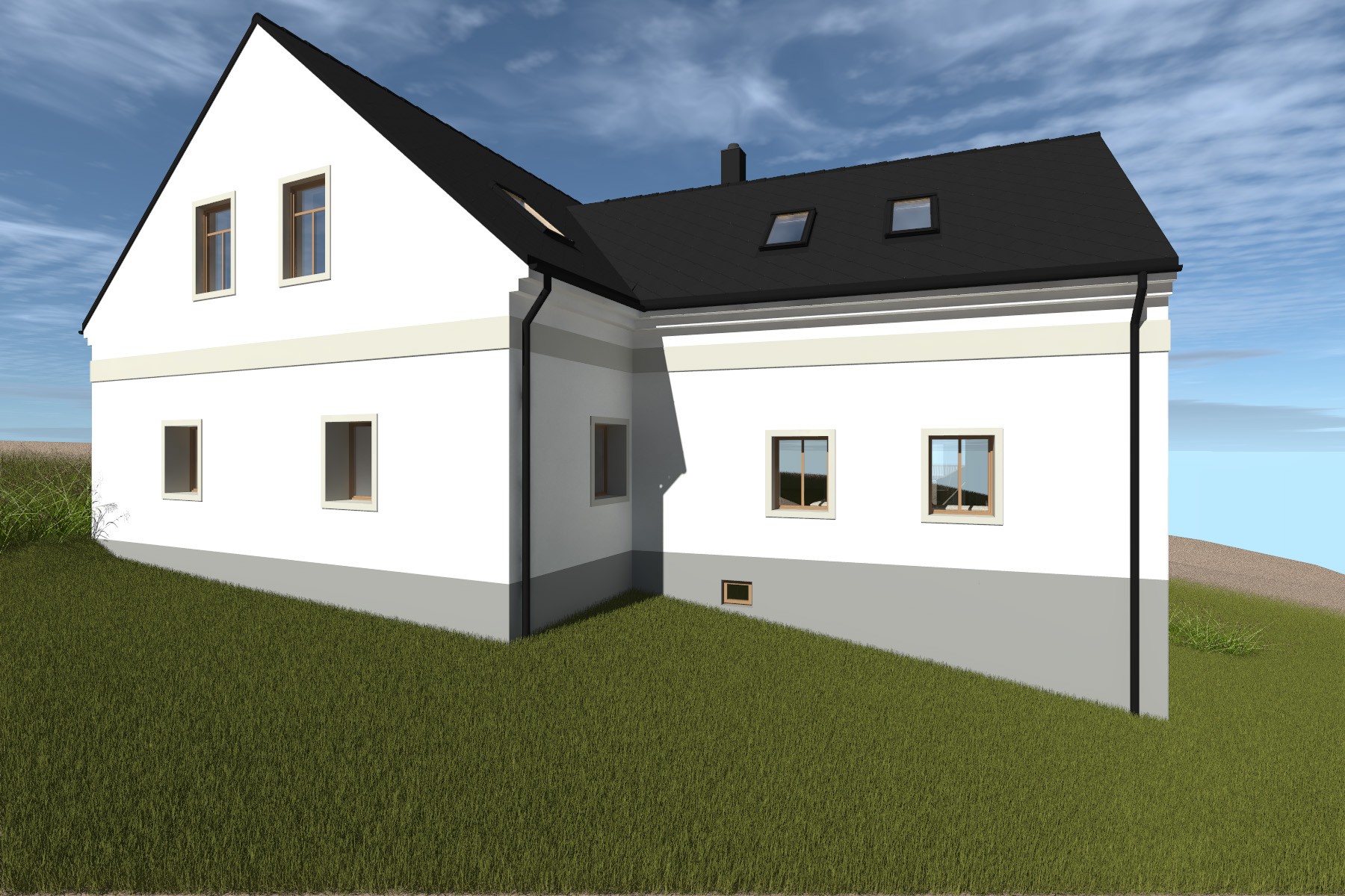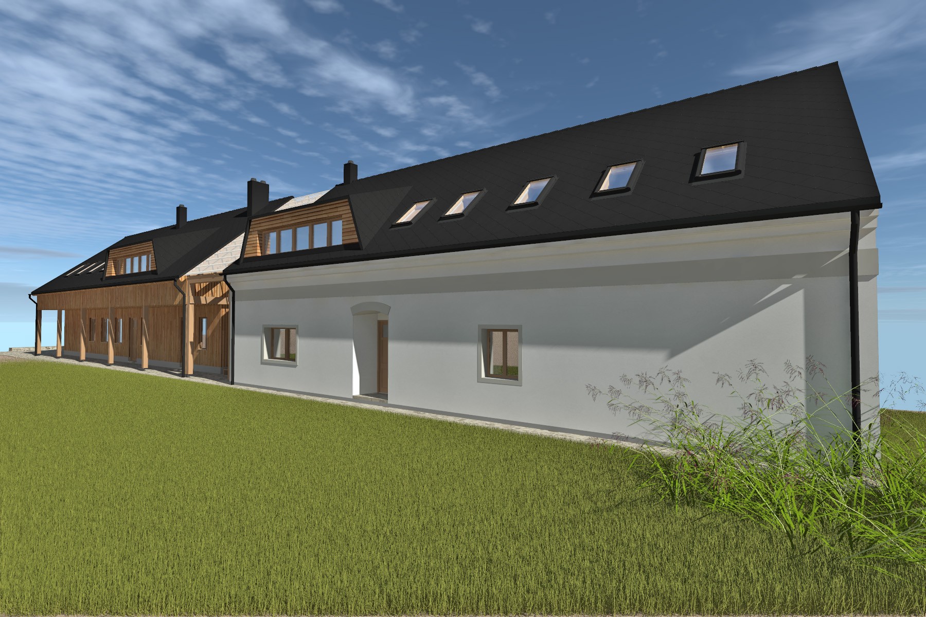Stávající dům je částečně zachován – dochází k odstranění nevhodných pozdějších úprav a k novému využití podkroví pro bydlení. Objem stavby je doplněn o novou hospodářskou část navrženou jako dřevostavba, která s domem vytváří krytý vstupní prostor a navazuje na tradiční uspořádání venkovských usedlostí.