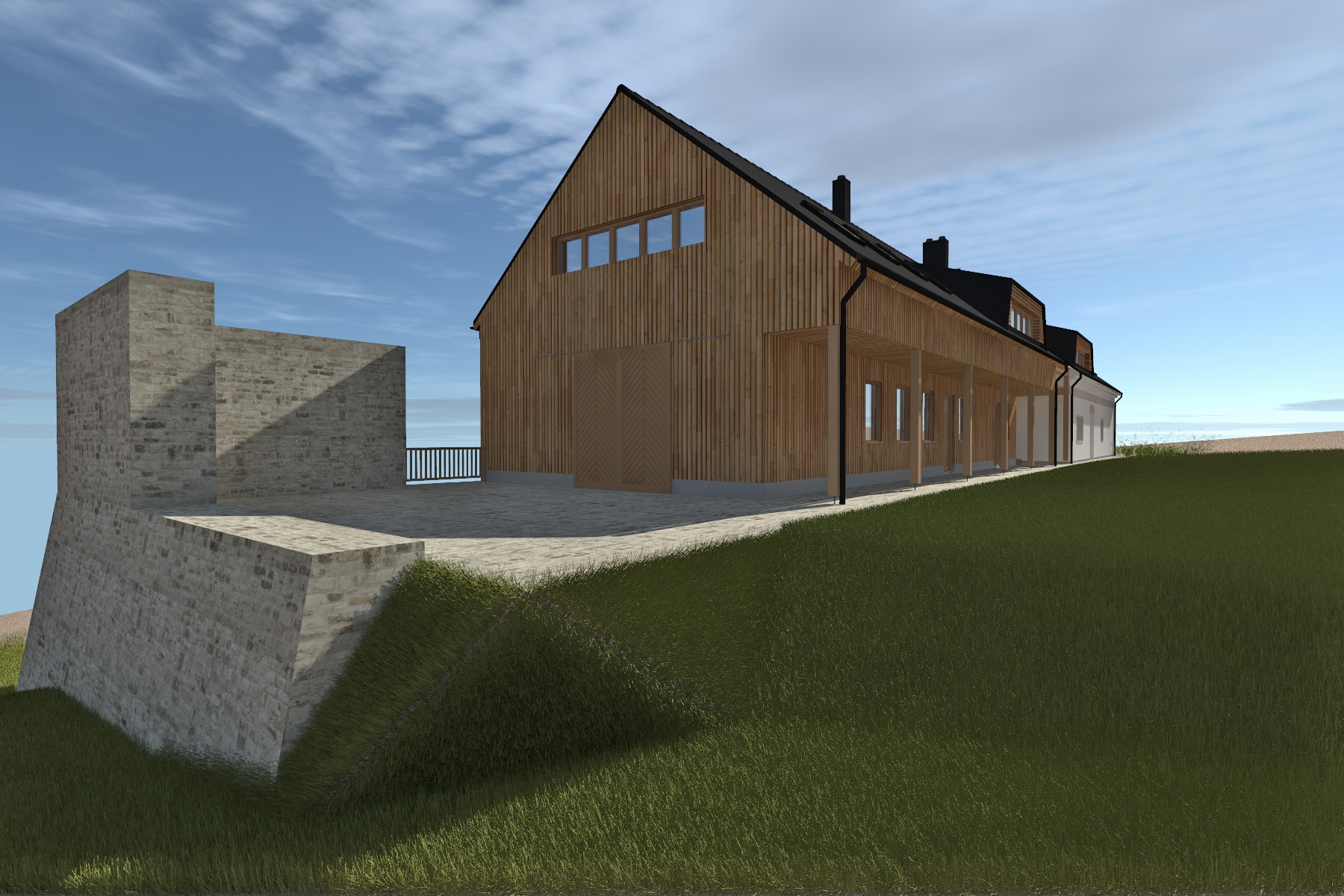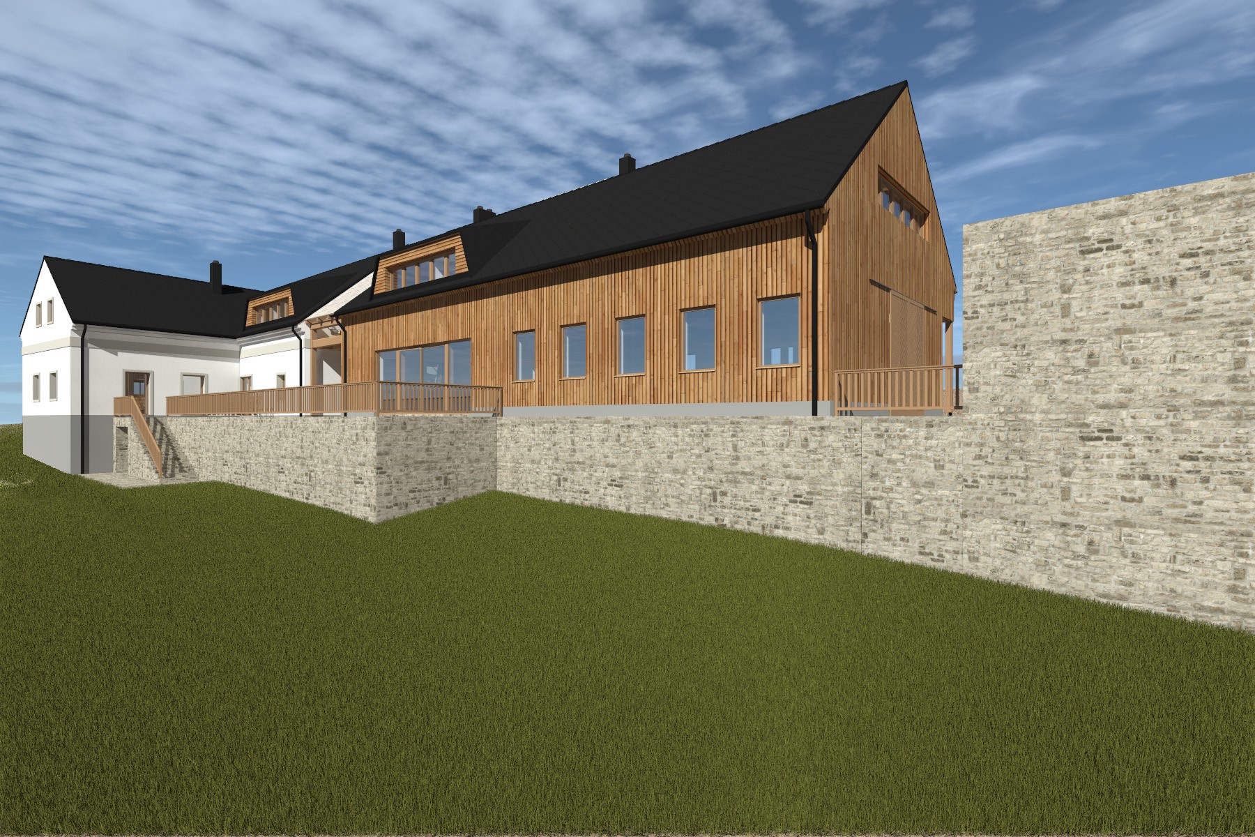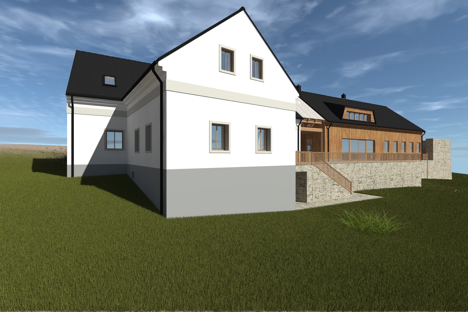 Materiálové řešení kombinuje bílou omítku původního domu s dřevěným obkladem nové části v odstínu modřínu. Jednotící prvek tvoří tmavá střešní krytina a kamenné prvky navazující na charakter místní architektury. Návrh respektuje historickou stopu místa a současně ji doplňuje současným architektonickým výrazem.