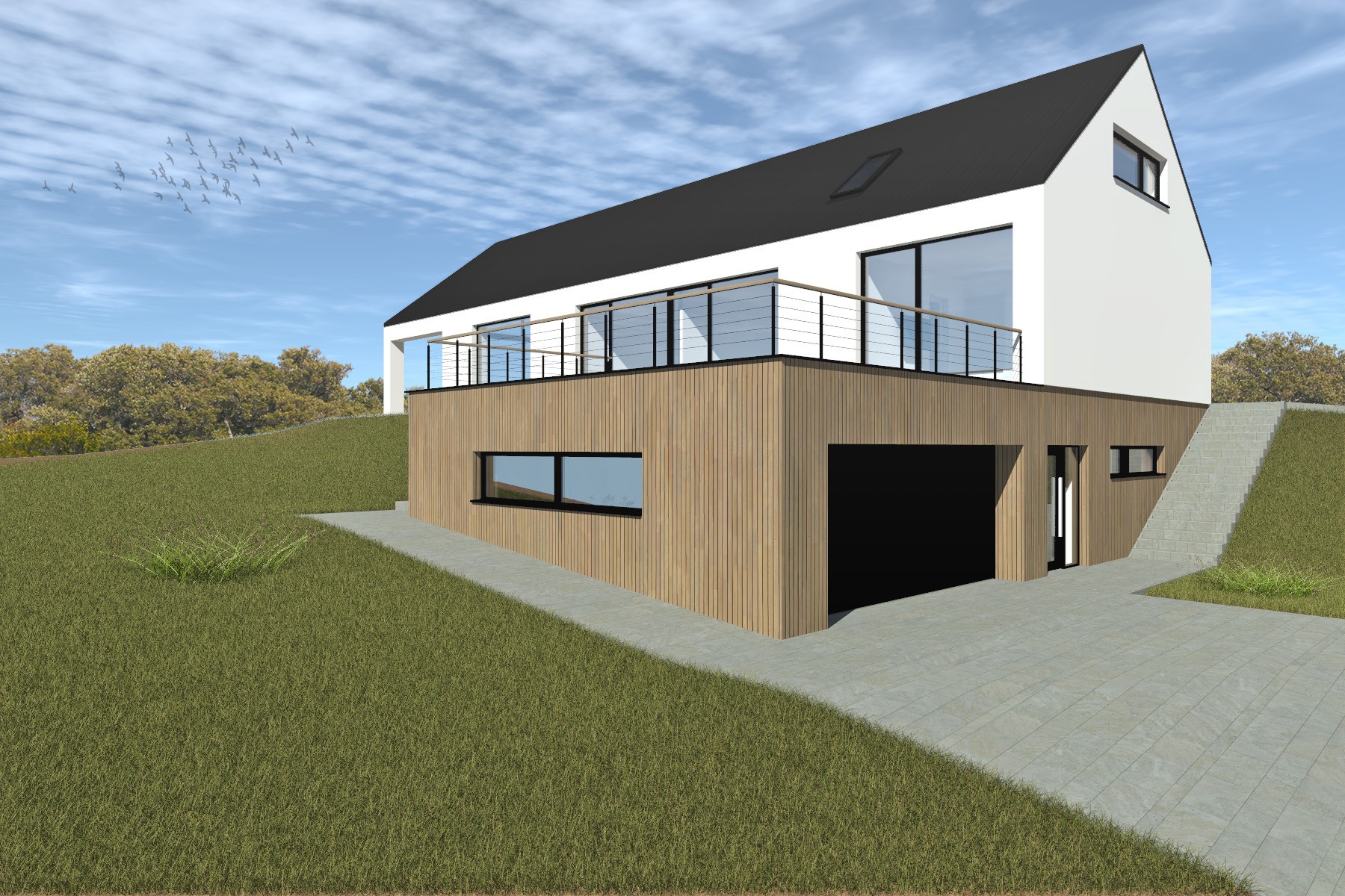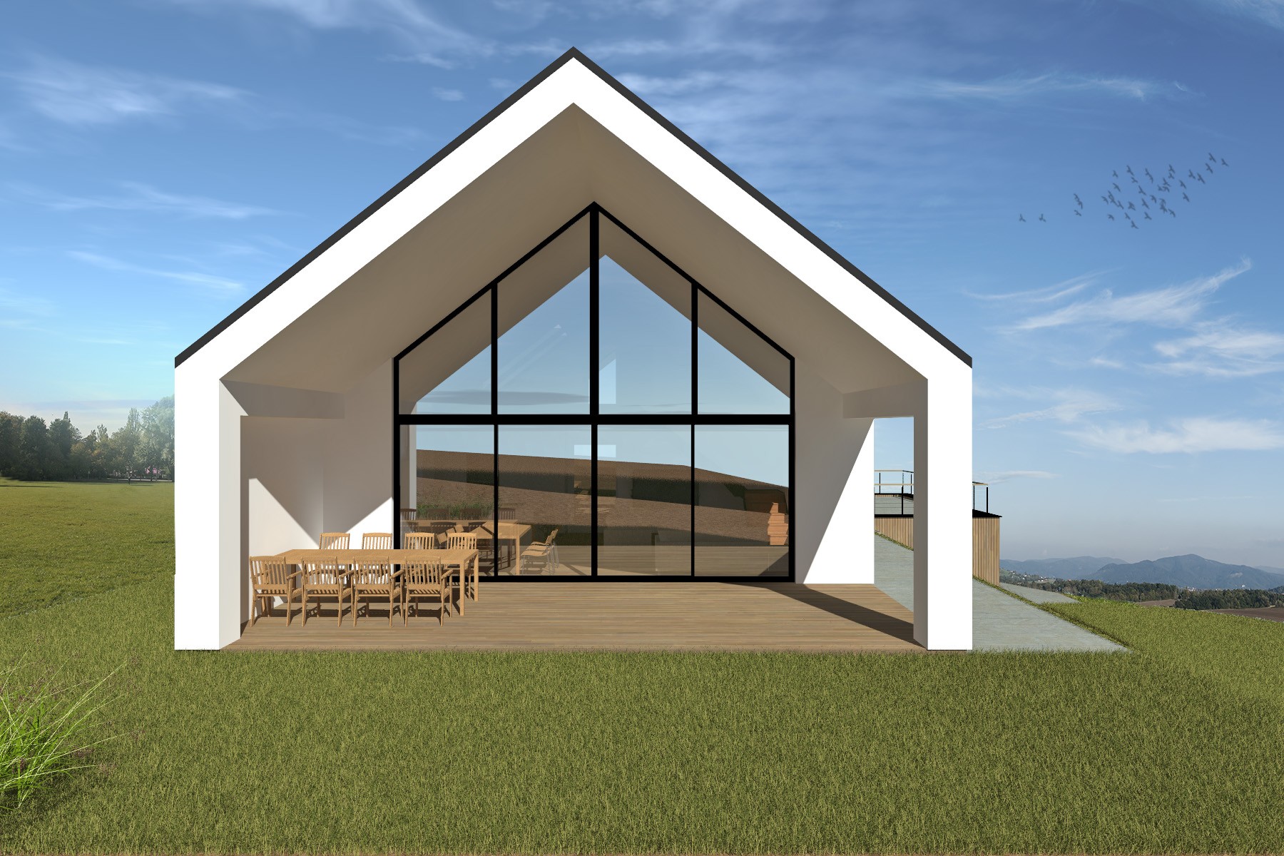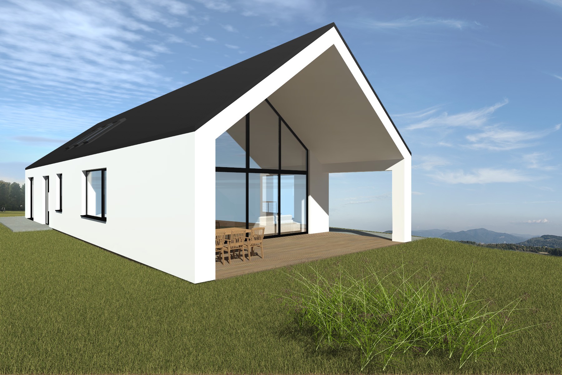 Výraz domu je založen na kontrastu bílé omítky hlavního objemu a dřevěného obkladu spodní části stavby. Velkoformátové prosklení ve štítu otevírá interiér směrem do krajiny a navazuje na krytou terasu, která rozšiřuje obytný prostor směrem do zahrady.